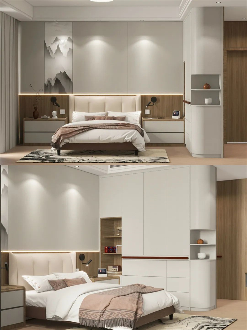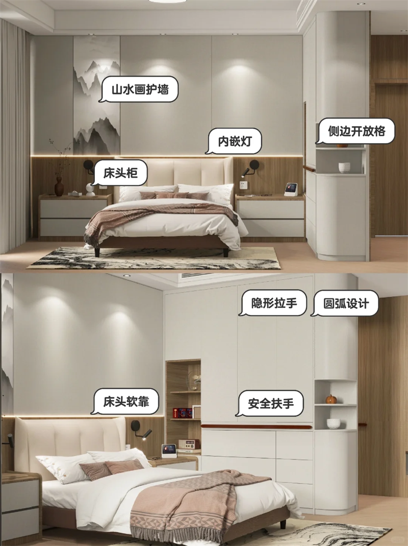 ▪️床头护墙板融入山水画,更符合爸妈审美,装内嵌感应灯,方便夜间起床。