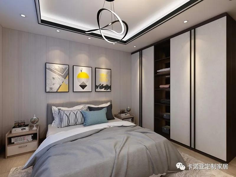 主卧选用了入墙式的开门衣柜,容量大,造型美观整体。淡灰色的墙面与床品的灰色系呼应整体的黑白色调,