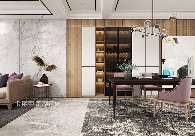 餐厅比较小清新风,淡紫色的餐凳,木色和白色相间的墙面,颜色清新的装饰画,都让人很舒适轻松。