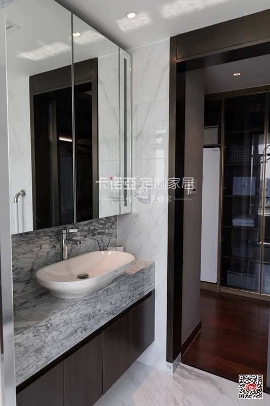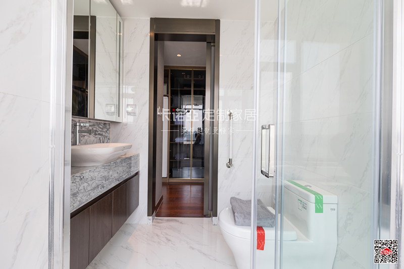深色浴室柜体点睛,加上大面积玻璃的使用,卫生间大气明亮,空间通透开阔。