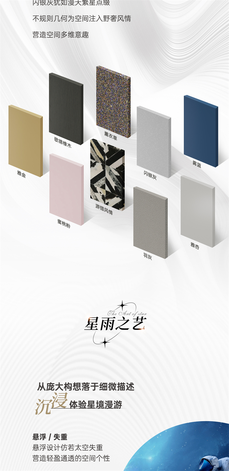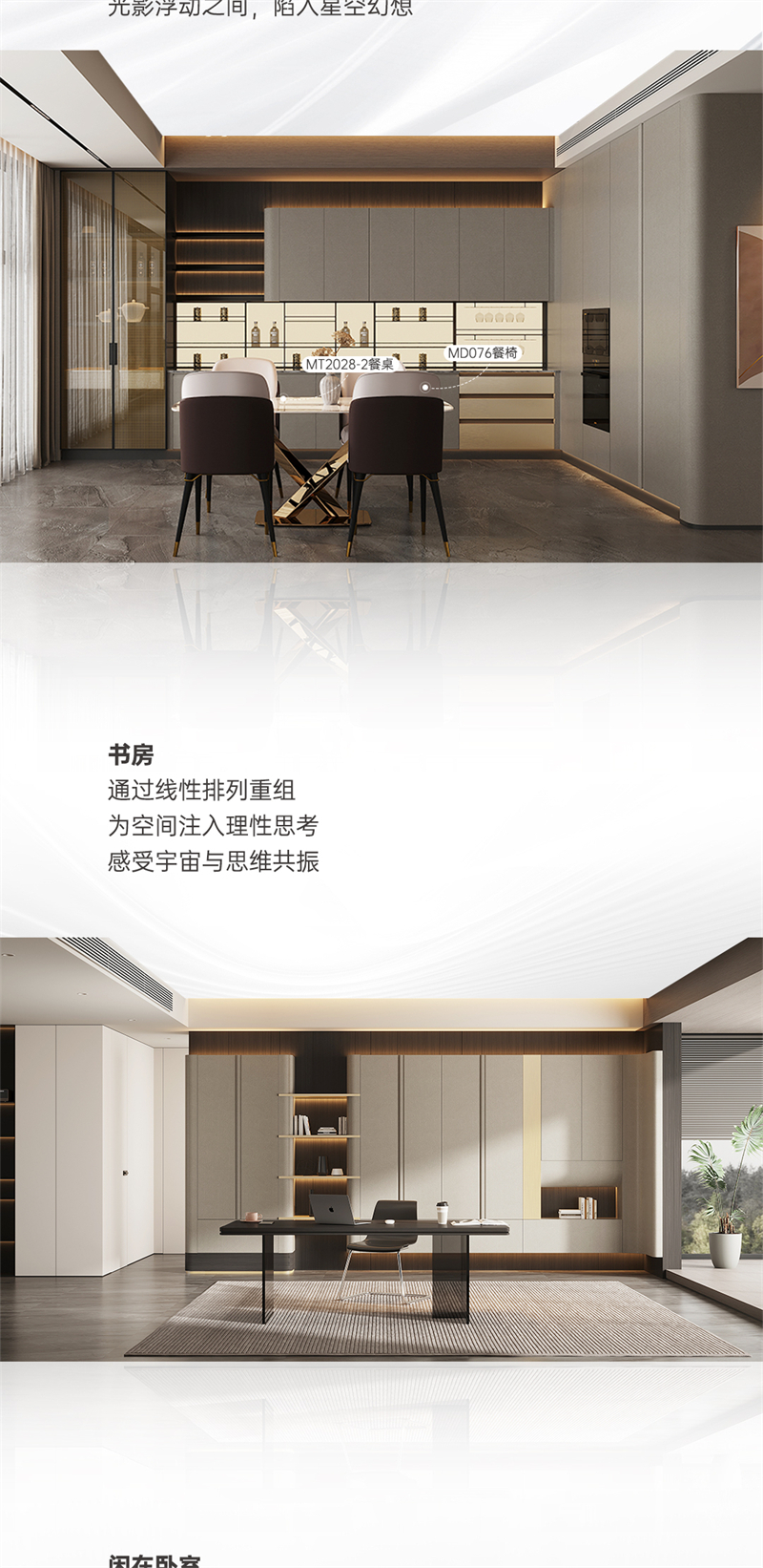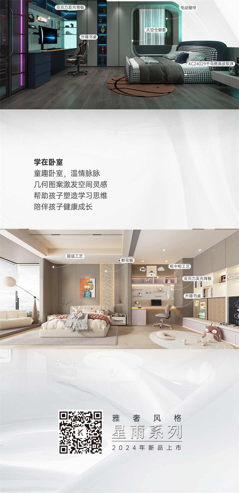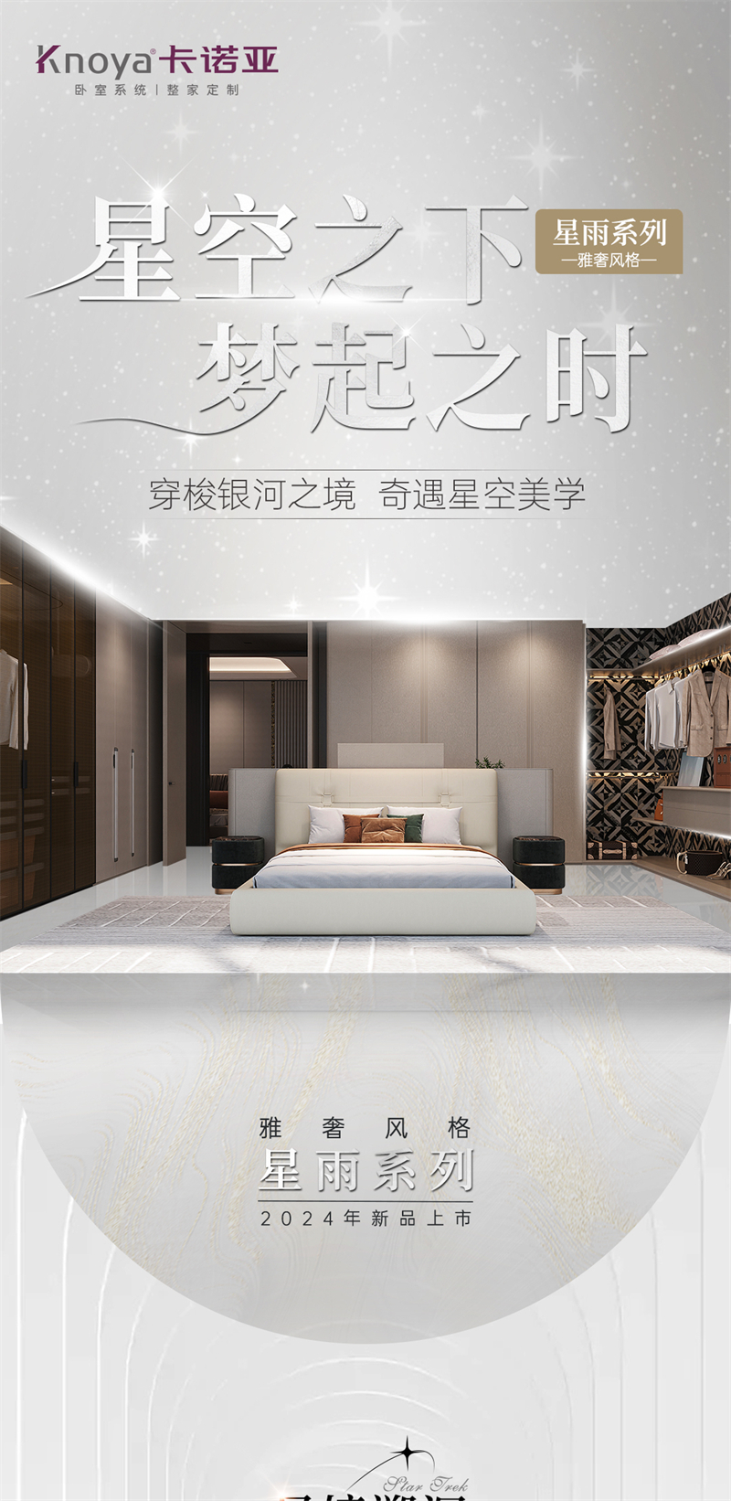2024年新品系列,星雨 |雅奢风格 该系列产品采用柔和的色彩搭配和浪漫的元素点缀,打造温馨浪漫的家居氛围。闲在卧室:演绎高端人居雅奢生活 ,沉浸精智卧室空间,畅享居家仪式感,将生活舒适与当代美学精细度融合