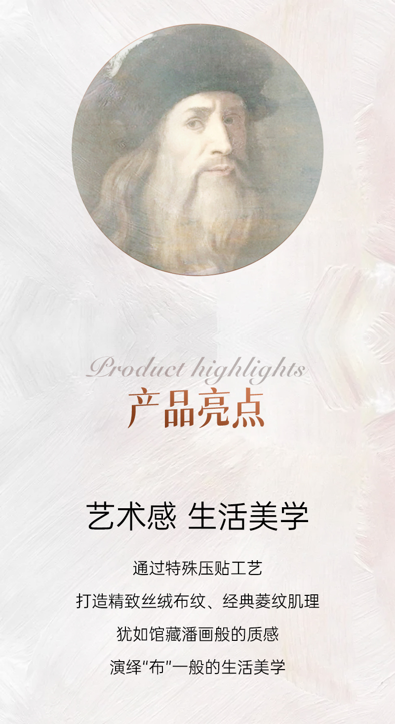 通过特殊压贴工艺,打造精致丝绒布纹、经典菱纹肌理,犹如馆藏潘画般的质感,演绎“布”一般的生活美学