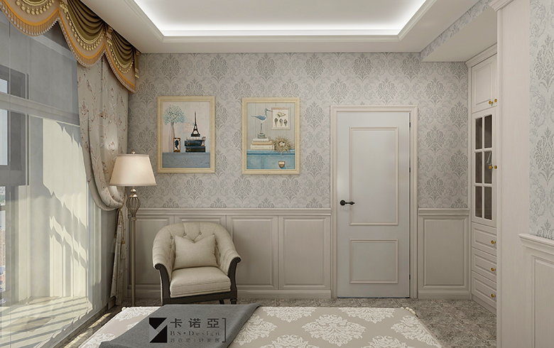 高原雪橡天然素净的白,营造出极为洁净素雅的家居环境,墙裙式护墙设计与欧式纹饰的壁纸、同色到顶衣柜融为一体,结合精致的吸塑造型、素雅的软装配饰、欧式造型窗帘、西洋挂画,轻松营造出纯净、美好的简欧家居氛围。