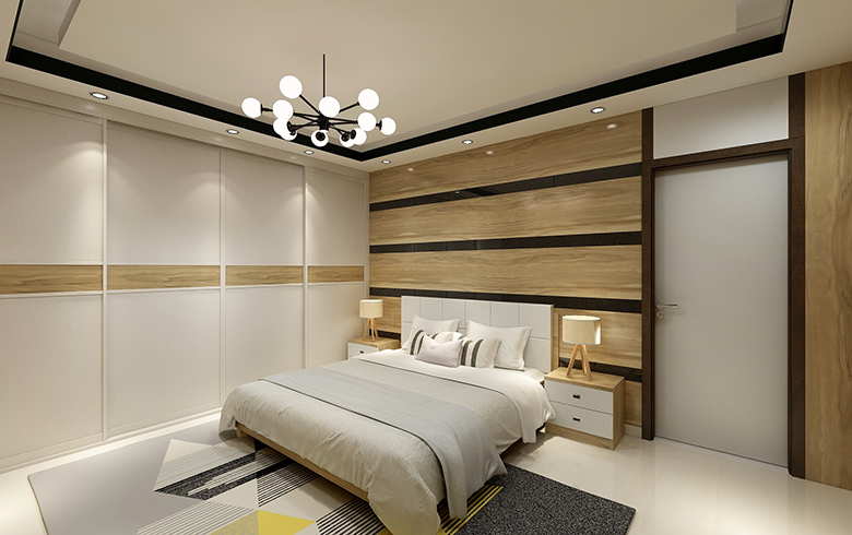 床头护墙板清晰自然的橄榄木纹理,让空间更具北欧风,色泽饱满的黑镜饰面点缀其中,散发高贵冷艳的光泽。