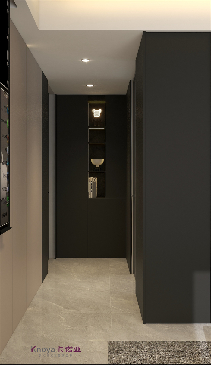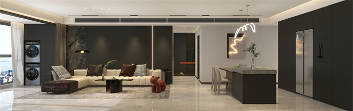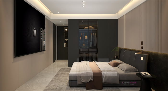 本案业主更注重与家人们的空间情感交流。户型墙体的拆改 使布局流线更顺畅,更锲合业主的需求。玄关客餐厅采用门墙柜一体化设计,化繁为简。鞋柜穿插式设计既有储物功能又有美感。哑光岩板嵌入式电视背景+深色系墙板隐形门,延伸整个空间,壁炉和金属套格更显高级感,沉稳大气。内嵌式酒柜包冰箱管线机,兼具储物、装饰、颜值一体。餐桌岛台做了错位式设计,即贴合了业主的日常家居需求,又与整体空间色系相呼应。卧室无主灯的设计还具备多种情景模式,进一步提升了卧室的氛围体验。
