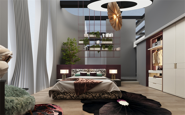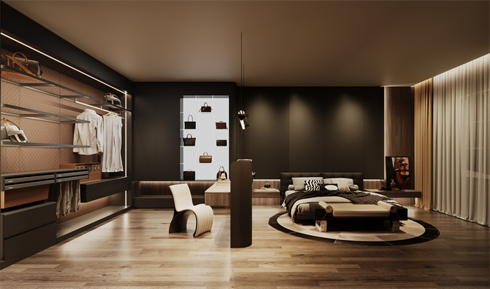 逐梦系列设计灵感上,源于当代精英女性对精致生活的追求,代表着公司白领“忙在卧室”的优雅和独立。设计手法上,整个卧室空间按一体化多功能打造,满足办公、休息、放松、娱乐的需求。