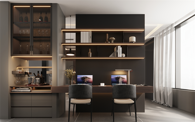 【办公区】设计师将卧室改造成一个专用的工作空间,而不会牺牲卧室的舒适性,解锁居家办公的N种优雅姿势,双人办公桌、咖啡角、精美装饰,为梦想注入源源不断的能量。