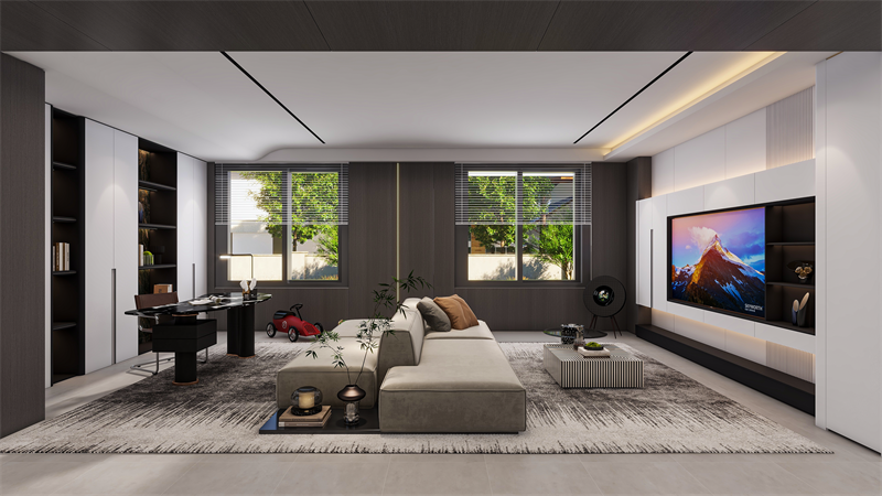电视背景墙采用简洁流畅的线条,与简约的“晨露白”色彩完美融合,弧形转角过渡,展现一种简约而不失精致的柔美感。电视柜采用高端定制精湛工艺,包括黑科技的悬浮设计+柜中柜设计+拉米诺/无孔工艺,打破传统墙面的厚重感,赋予空间轻盈灵动的观感。