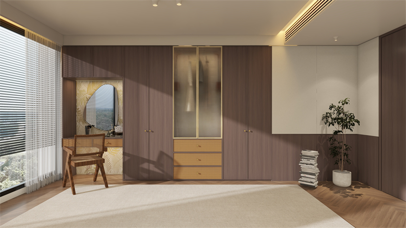 整个空间以深色木纹打底,大面积的木纹拼框柜门,既保留中古经典特色,也兼备古典与现代美感。衣柜局部应用长虹玻璃,嵌入梳妆台,搭配内嵌灯带,透光不投影的朦胧感,惊艳每一天。