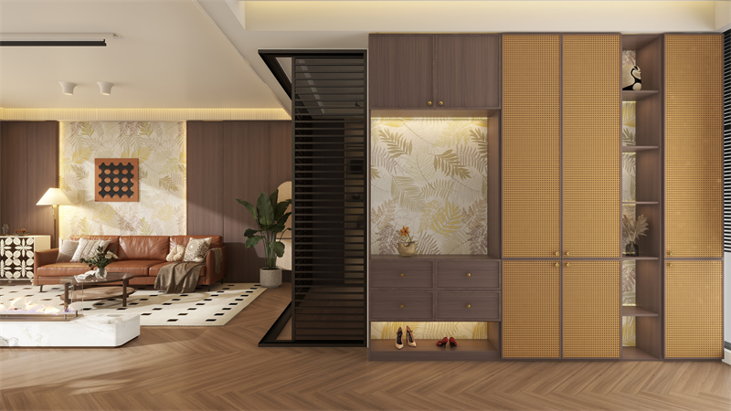 微醺滤镜下的中古风,从入户起就开始铺垫复古的基调。胡桃木纹理搭配咖啡色藤编,让古朴的气息从玄关开始,弥漫家中每个角落,以复古高级的腔调为画笔,勾勒出自带电影氛围感的空间,打造富有享受的视觉空间。