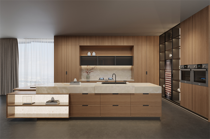 产品亮点:1.形:K冕拉手门型将冠冕与K字原创设计相结合,巧妙传递品牌的尊荣之意。2.质:甄选天然木皮,其天然纹理与自然色彩,赋予空间沉稳深邃之感。3.气:镶嵌、圆弧、3D数码打印等传统工艺与现代技术结合,现代中式美家呼之欲出。4.韵:冰裂纹发光板的运用,宛如冰凌闪耀,映照星光,为空间增添梦幻般的诗意氛围。5.神:中岛台升降置物架、高端智能衣物护理机等智能配置,为生活带来便捷与品质。
