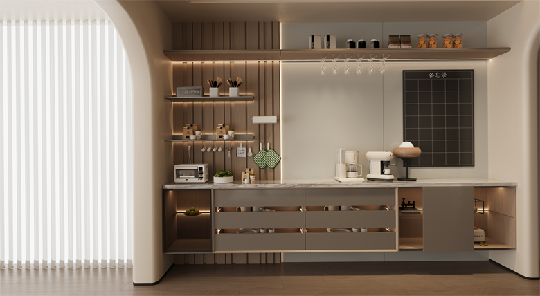 布局设计上,罗亚全屋定制更是打破了家居就该有固定模样的陈规。餐厅与阳台不再是割裂的存在,而是被打造成联动的“咖啡区 + 品酒区”;早晨在这里冲一杯手冲,用咖啡香唤醒元气;夜晚调一杯利口酒,让微醺消解疲惫。