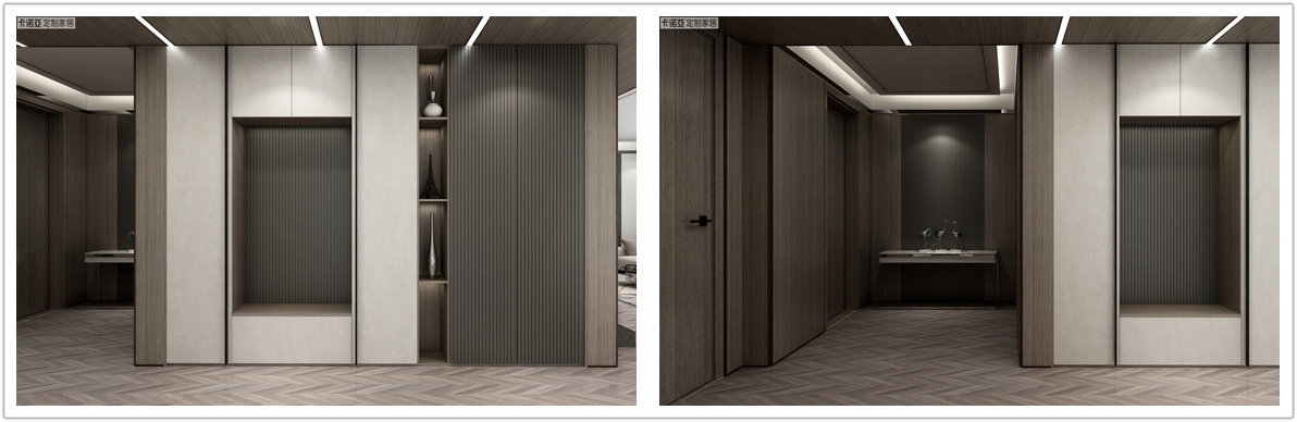 墙面以木纹为基础,搭配91视频污版下载“慕尼黑”凹凸格栅护墙板,丰富了空间的层次感。方正对称的结构设计,柜体墙面一体化,视觉上整体统一。