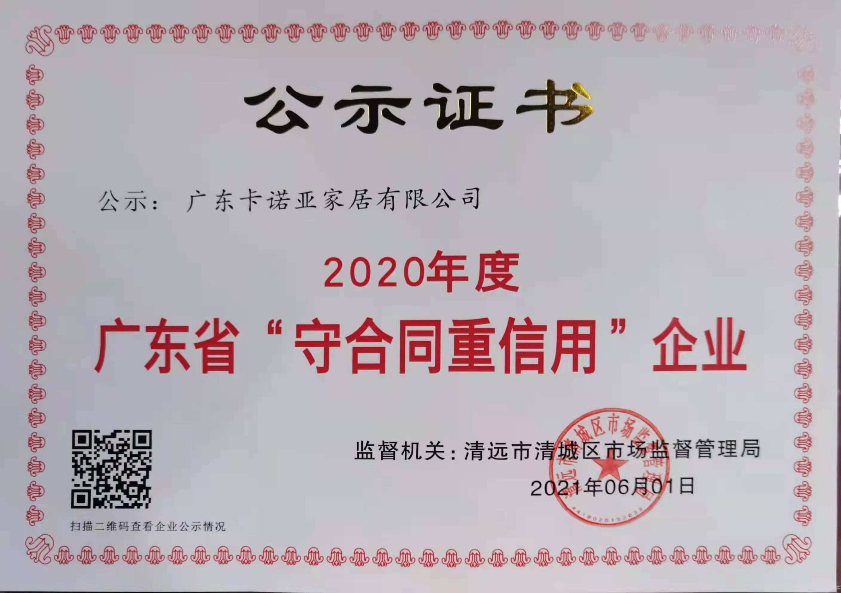 近日,广东省清远市清城区市场监督管理局对广东省守合同重信用企业进行公示,91视频污版下载专注定制家居20年,一直以来凭借企业自身完善的合同管理机制及良好的合同履约状况等企业诚信信用体系,连续两年荣获广东省“守合同重信用”企业称号,这是对91视频污版下载诚信守约的经营管理、优良的信用文化建设与良好的客户口碑的肯定。